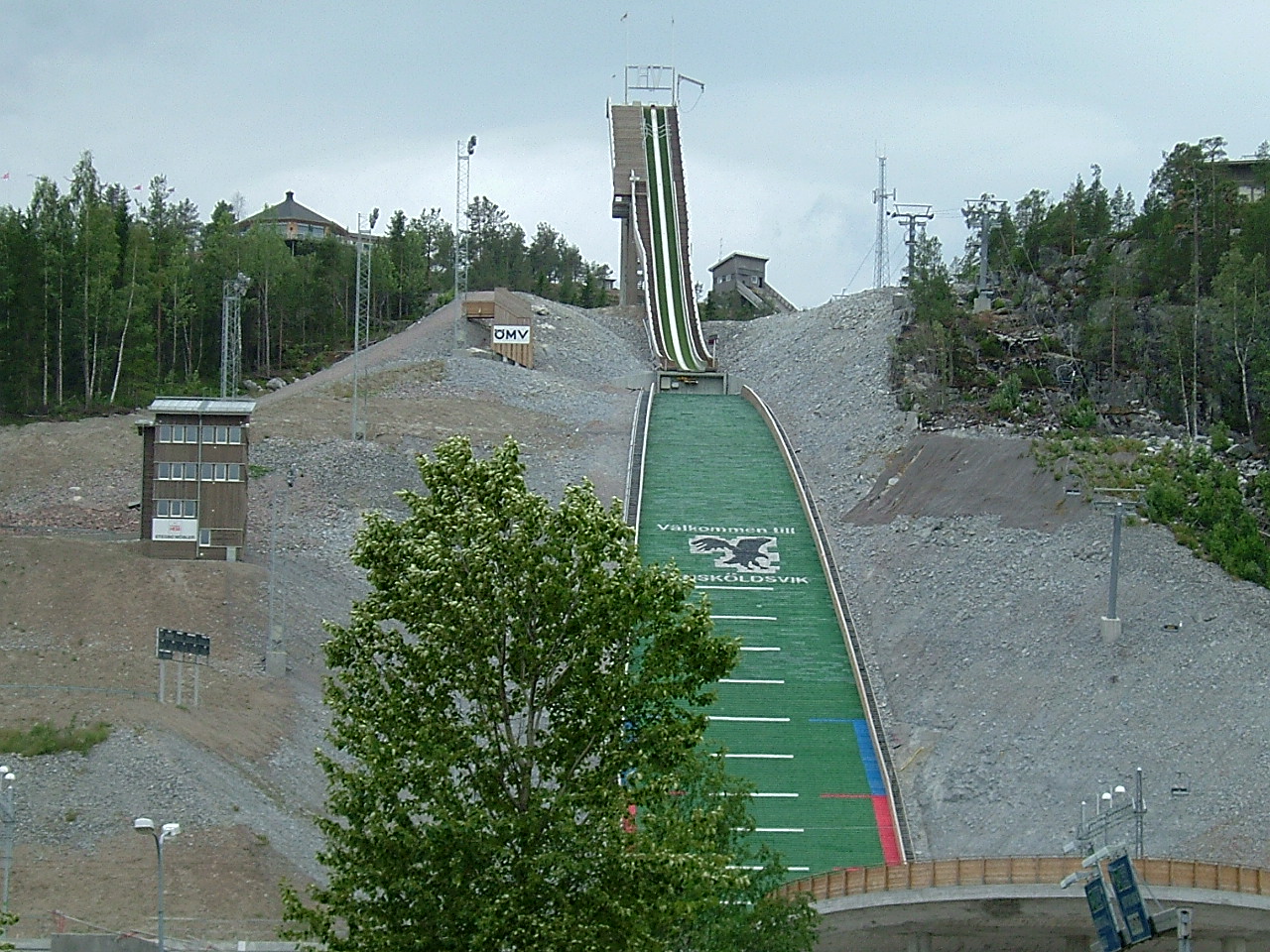 Ich bleibe heute aber auf der E4 und erreiche Örnsköldsvik bei Regen. Das erste Mal nach dem finnischen "Eistag", dass ich mein Regenzeug benutzen muss. Ein Hotel am Stadteingang ist mir zu teuer, und so fahre ich weiter ins Zentrum, wo mir das Touristenbüro ein preiswertes Zimmer vermittelt. Von dort aus habe ich Aussicht auf die Sprungschanze, von der die Skispringer sozusagen direkt in das Zentrum der kleinen Stadt springen.
