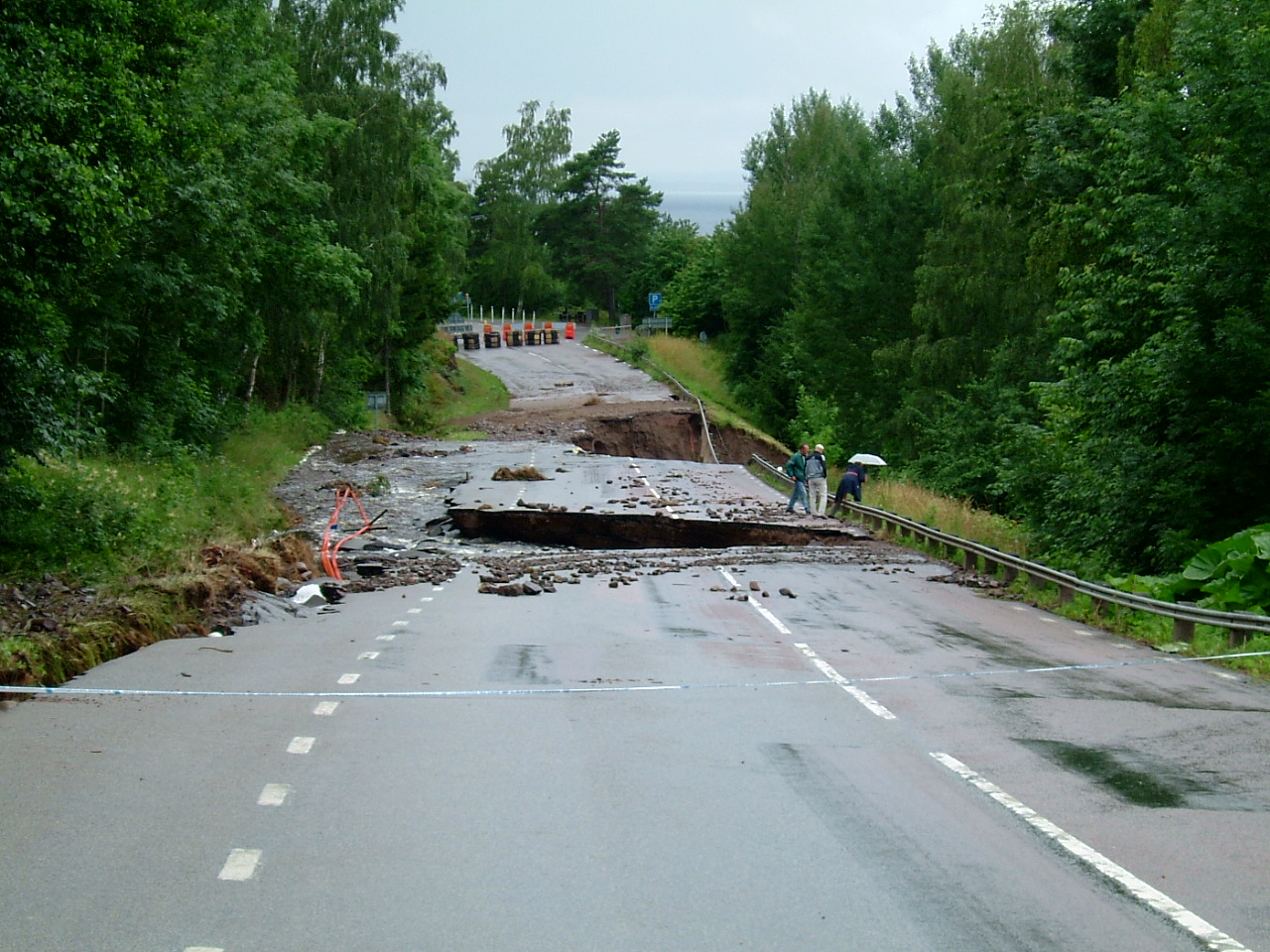 Der langanhaltende Regen der letzten Tage hat die zum See führenden Bäche anschwellen lassen, und einer von ihnen hat Teile der Uferstraße unterspült und weggerissen. Mir bleibt nichts anderes übrig - ich muss umdrehen und links in die Berge hinein. Da sind einige Anstiege zu bewältigen, bei denen ich in den kleinsten Gang schalten muss. Die Waldwege sind nass, matschig und glitschig, so dass die Fahrt nicht nur anstrengend ist, sondern auch höchste Aufmerksamkeit erfordert. Auf diese Weise wird der "Spaziergang" nach Jönköping doch noch zu einer anstrengenden Tour. In unmittelbarer Stadtnähe führt ein Radweg parallel zur E4 und mir fällt auf, dass hier sehr viele LKW's aus den neuen Bundesländern unterwegs sind.